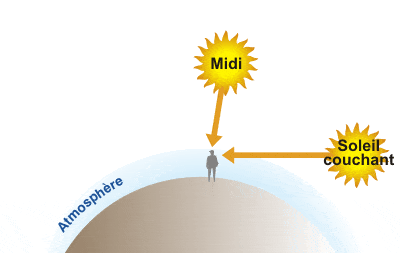 Au-delà de la composition de l’air, c’est l’épaisseur d’atmosphère traversée qui compte. Plus le soleil est haut, plus la traversée est courte, moins il y a de pertes. À l’inverse, quand le soleil rase l’horizon, l’épaisseur d’air et la diffusion augmentent, l’éclat s’estompe, d’où cette possibilité de regarder l’astre couchant sans être ébloui. En montagne, où l’atmosphère est amincie, les rayons frappent avec plus de vigueur.