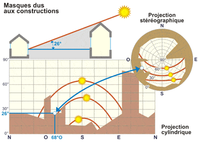| Les obstacles au soleil proviennent du relief, de la végétation, des constructions voisines ou d’éléments architecturaux du bâtiment lui-même. |