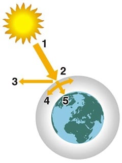 Environ 35% du rayonnement intercepté par la Terre repart vers l’espace, réfléchi par l’atmosphère ou la surface. Une part du rayonnement, dispersée par les molécules, aérosols et poussières, donne ce bleu limpide au ciel. La vapeur d’eau, le dioxyde de carbone et l’ozone absorbent aussi une portion du flux. Au final, seule une fraction de l’énergie atteint directement le sol.