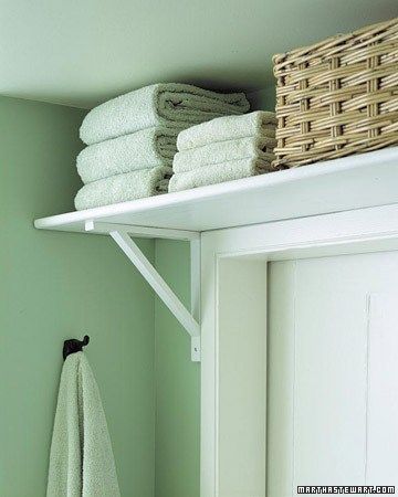 Lâ Ă©tagĂšre au-dessus de la porte est une autre grande zone oĂč vous pouvez placer une Ă©tagĂšre avec divers produits. Voyez comment, sur la photo ci-dessous, les serviettes sont coordonnĂ©es avec le mur â câest une autre idĂ©e de rendre lâespace plus large et de rendre lâeffet global plus propre et bien rangĂ©.